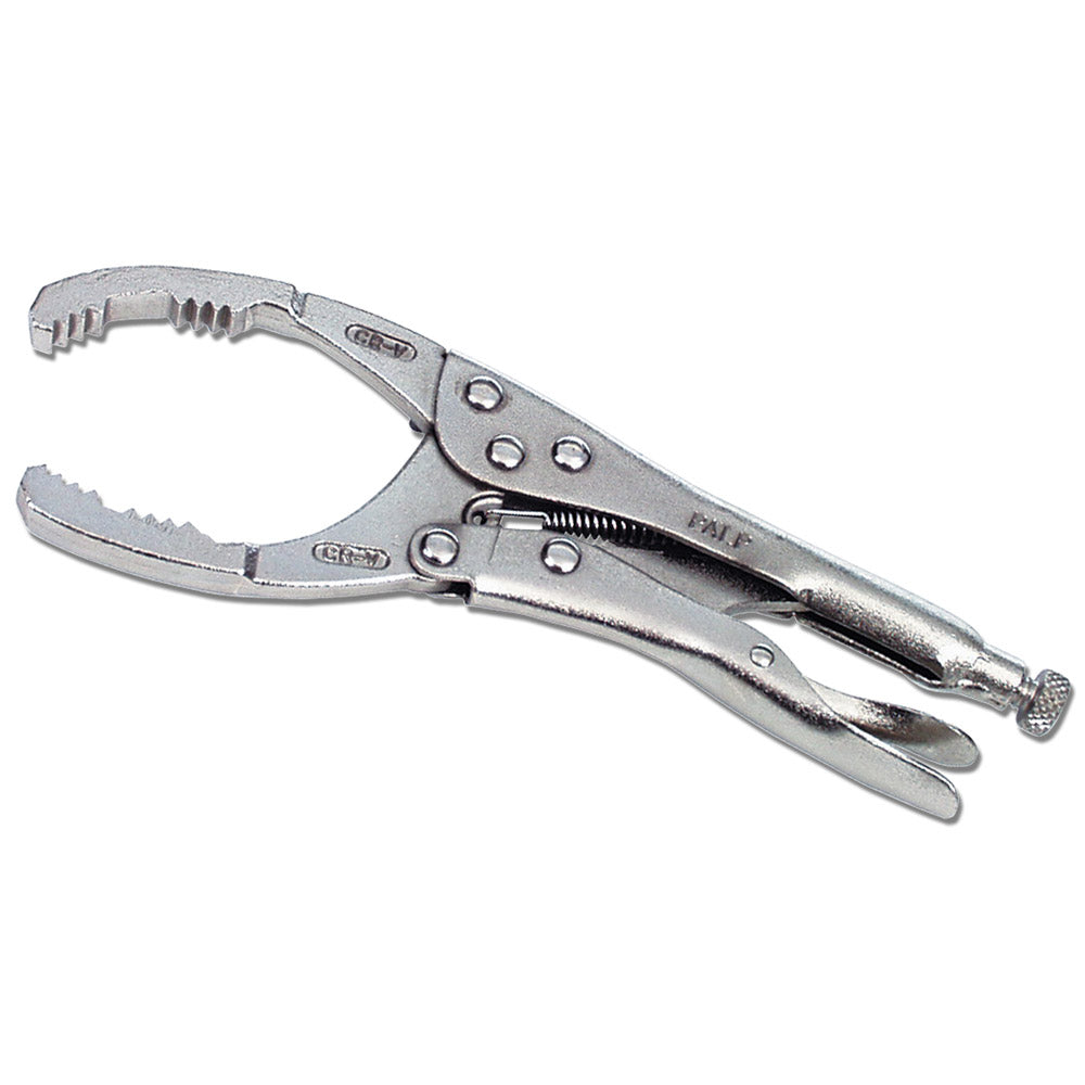 Alicate de presión para filtros de aceite, fabricado en acero cromo vanadio, con mangos delgados para fácil agarre y comodidad.