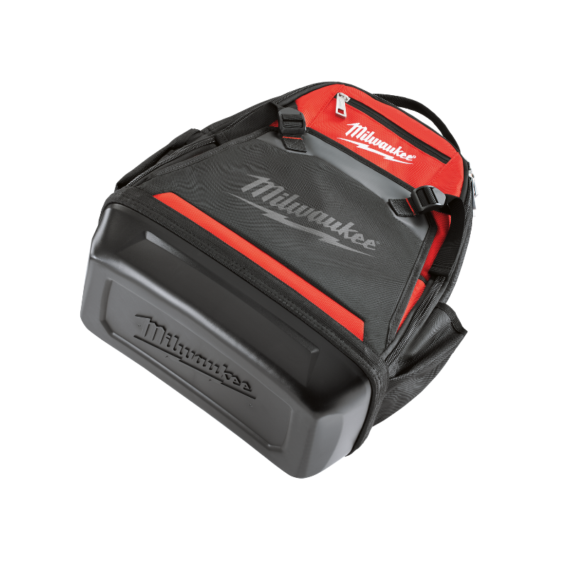 La mochila Milwaukee Jobsite se diseñó pensando en los comerciantes profesionales y se construyó con material duradero de 1680 denier y una base moldeada resistente al impacto y al agua.
