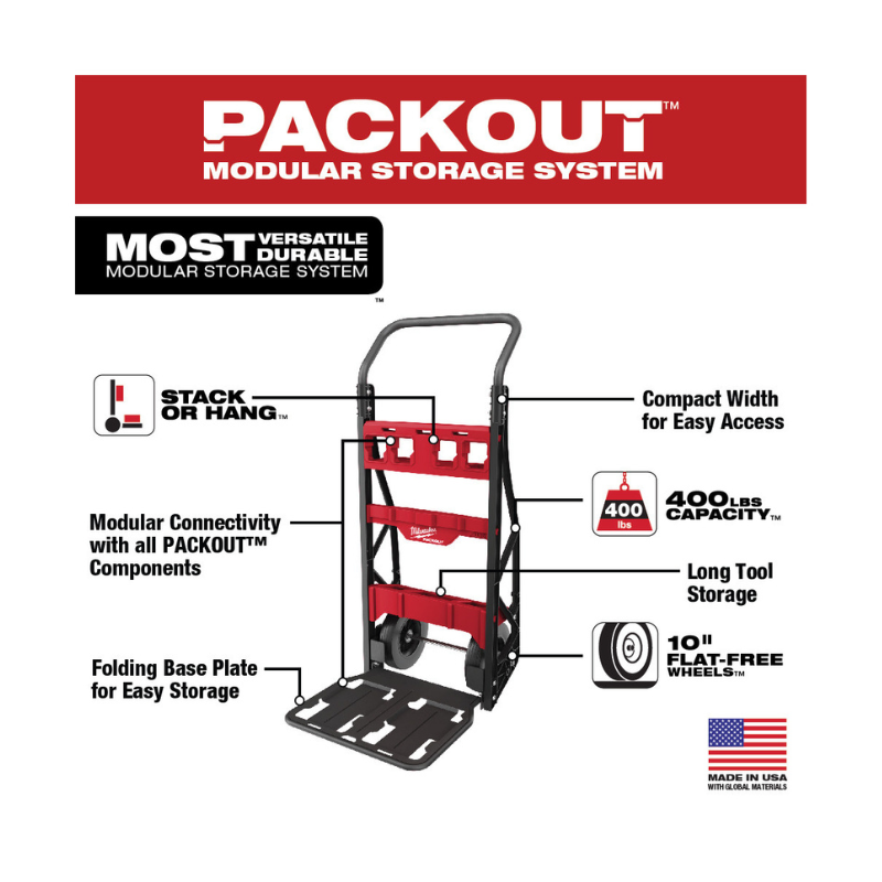 Nuestro sistema de almacenamiento modular PACKOUT™ es el sistema de almacenamiento más versátil y duradero de la industria. El carro de 2 ruedas PACKOUT™ tiene un montaje PACKOUT™ integrado en la base y el cuerpo, lo que le permite al usuario apilar o colgar productos PACKOUT™ de manera segura. Gracias a su capacidad de peso de 400 lb y sus ruedas industriales de 10", este carro transporta fácilmente dentro y fuera del lugar de trabajo. El sistema de almacenamiento modular PACKOUT™ le permite personalizar su sistema de almacenamiento para transportar y organizar fácilmente las herramientas y los accesorios.