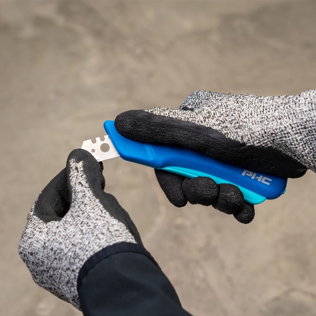 - Cuchilla auto retráctil de cierre inteligente al completar el corte, con diseño compacto y ultraliviano y gatillo de apriete de mano.