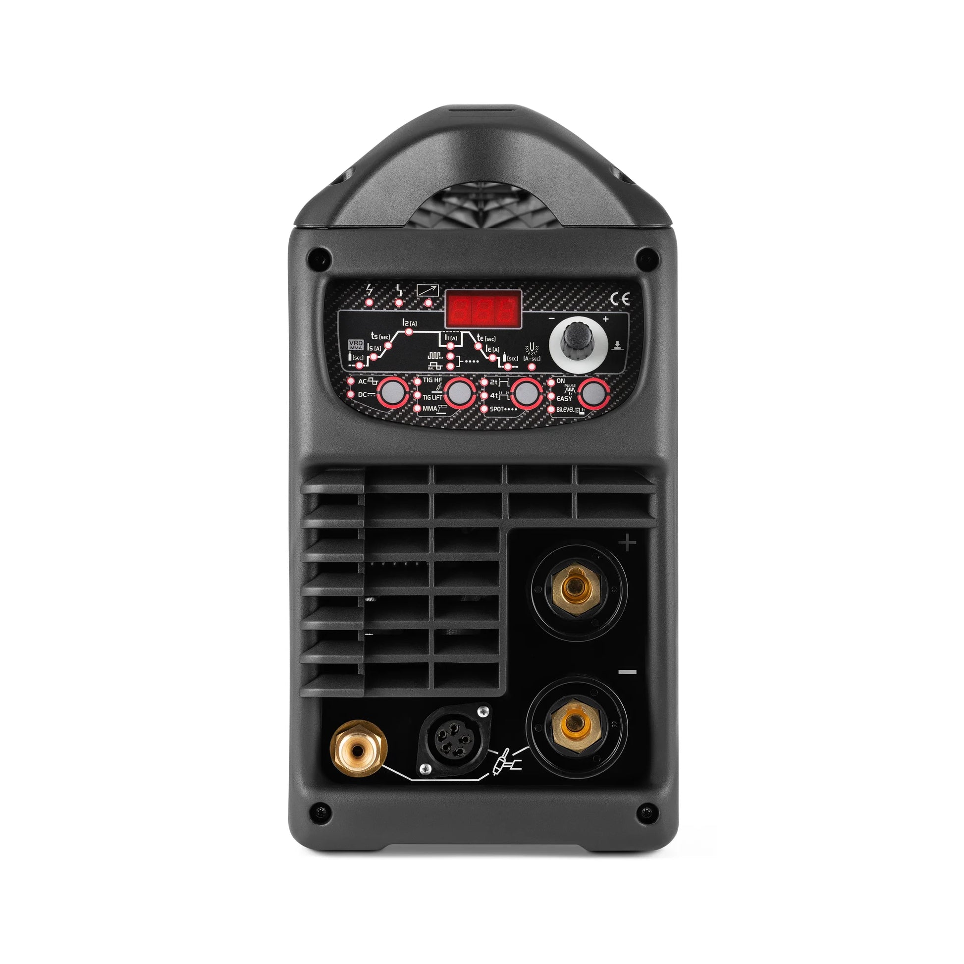 - Regulaciónes TIG: bi-level, corriente inicial/final, tiempo de soldadura por puntos, pre/post gas, rampa de subida y descenso corriente, balance, frecuencia de la onda cuadrada