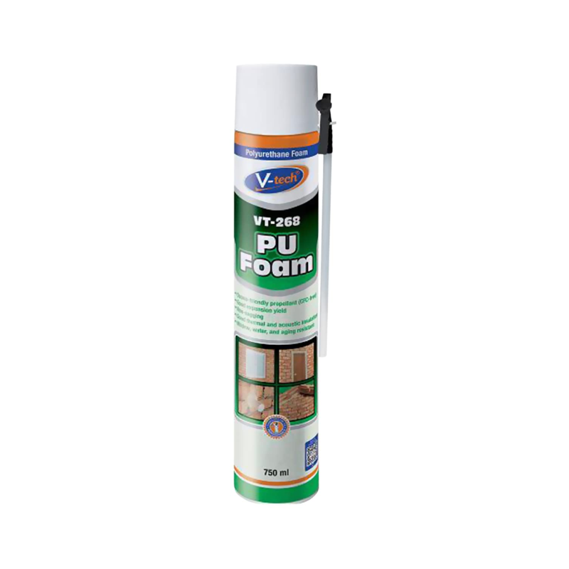 La espuma de poliuretano VT-268 es una espuma de poliuretano monocomponente que se cura con la humedad y está formulada para aplicaciones de uso general, como sellado, relleno, montaje, aislamiento e insonorización en hormigón, yeso, ladrillo, tarima flotante, la mayoría de los plásticos, metal, vidrio o madera. Tiene un buen rendimiento de expansión, no se descuelga y solo contiene propulsores que no dañan la capa de ozono (sin CFC). Es resistente al moho, al agua y al envejecimiento, y proporciona un buen aislamiento térmico y acústico.