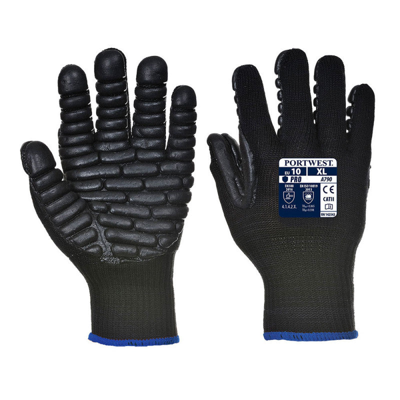 - Guante de algodón galga 10, nylon y caucho cloropreno especialmente diseñado para reducir los efectos de impactos y vibraciones al usar herramientas eléctricas, martillos neumáticos o demoledoras de hormigón