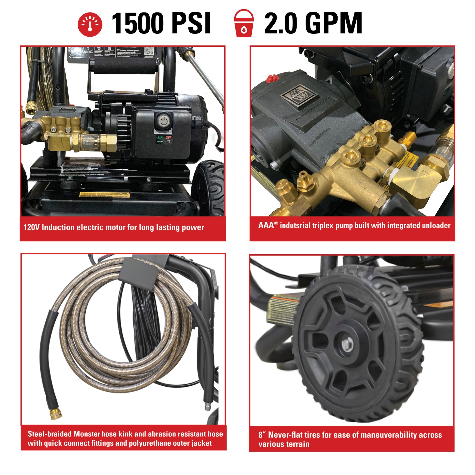 La hidrolimpiadora IR61094 está lista, Completa con características estándar que incluyen; un contador de horas, filtro de entrada de agua de alta resistencia, manguera Monster trenzada de acero con accesorios QC, e instrucciones específicas de configuración y uso impresas en los tableros de acero. Confíe en la durabilidad adicional de los marcos de aluminio de alta resistencia y las bombas triplex AAA industriales y un motor eléctrico confiable de 120V. Este IR61094 está listo para los trabajos difíciles de sus clientes.