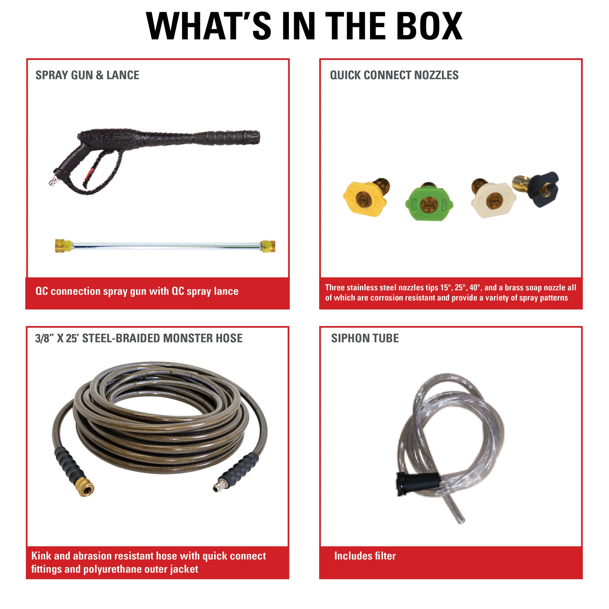 - Incluye: Manguera trenzada de acero de 3/8” 7.6 mts y 4 boquilla de conexión
