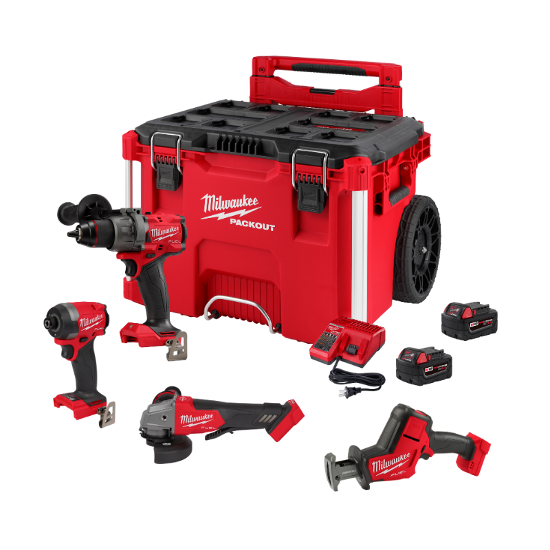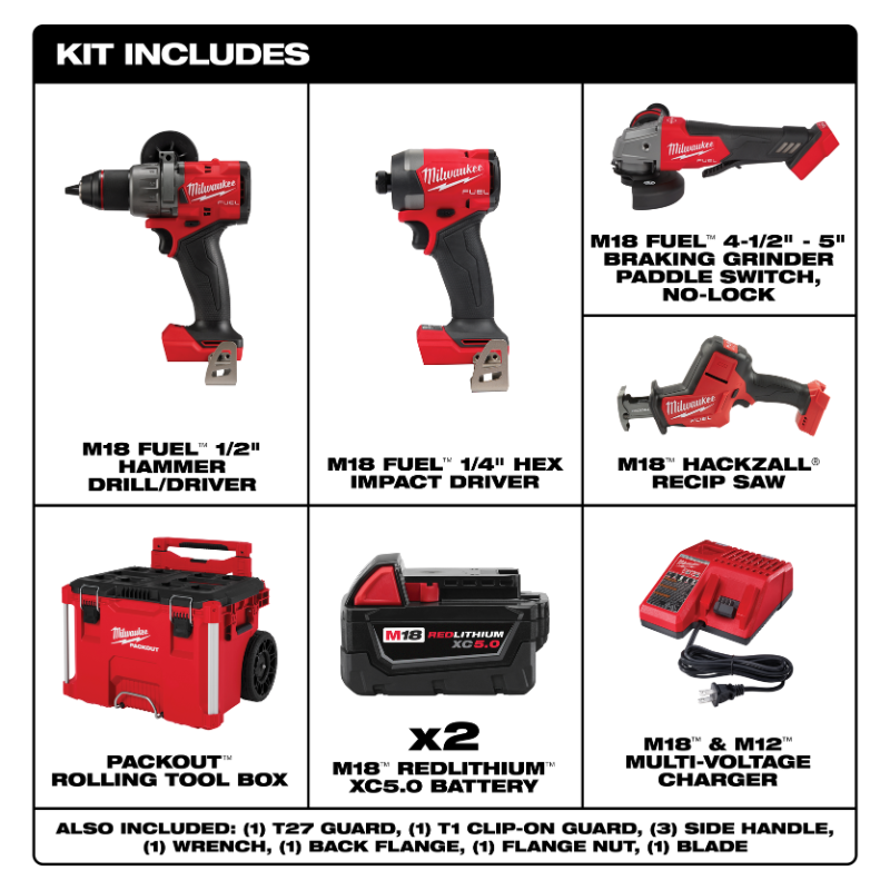 Este combo incluye el taladro percutor más potente y compacto de la industria, con AutoStop™ Control Mode para mayor seguridad del usuario, el atornillador de impacto más rápido y potente, una esmeriladora con freno electrónico que ofrece potencia equivalente a una herramienta con cable de 11A, y la sierra recíproca compacta HACKZALL®, líder en velocidad de corte con una sola mano.