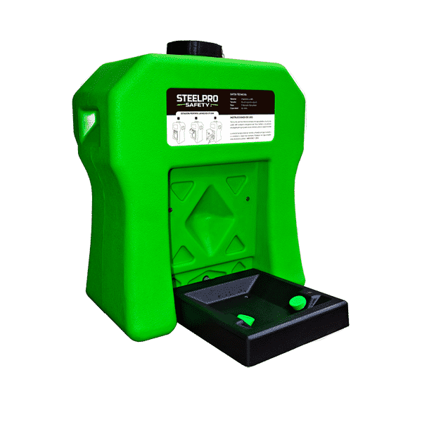 El lavaojos portátil Steelpro es un dispositivo diseñado para proporcionar una solución de emergencia en caso de exposición a sustancias peligrosas en los ojos. Este modelo está fabricado con polietileno de alta resistencia y tiene un distintivo color verde para facilitar su identificación.