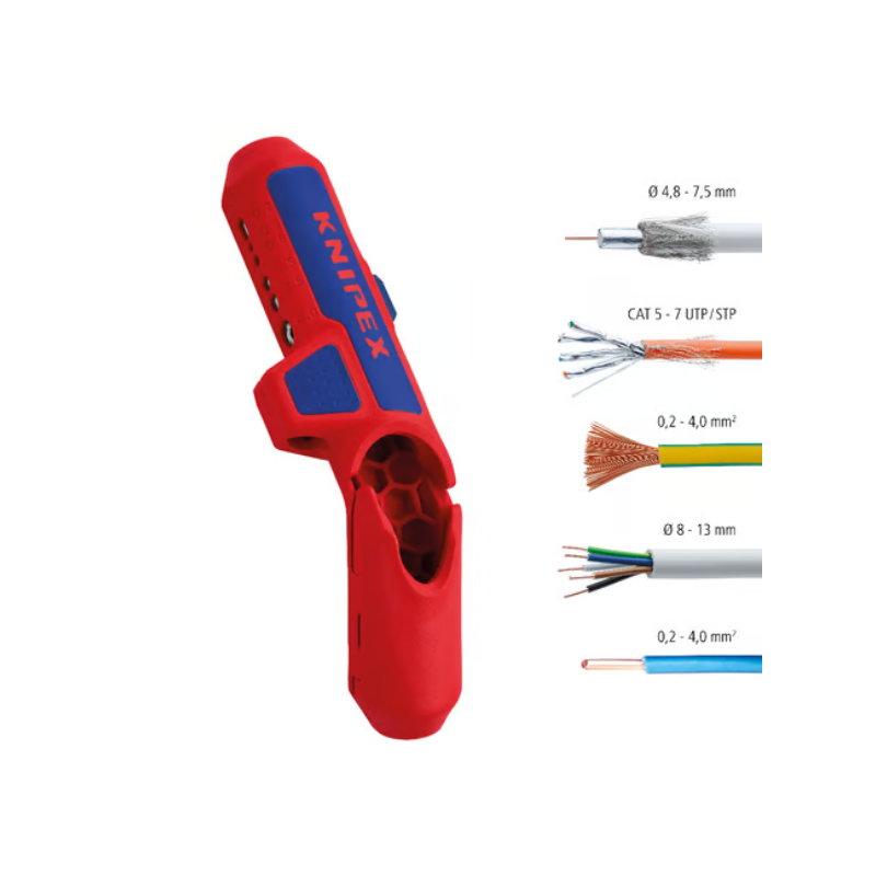 - Para pelar con rapidez y precisión todo tipo de cables convencionales redondos y cables antihumedad (ej: cables NYM de 3 x 1,5 mm² hasta 5 x 2,5 mm²) ,cables de datos (ej: Twisted-Pair) y cables coaxiales