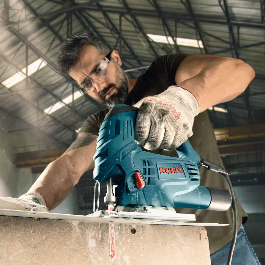 - El motor robusto de alta potencia de 550 W permite cortar hasta 65 mm de profundidad en madera y 8 mm en placa de metal